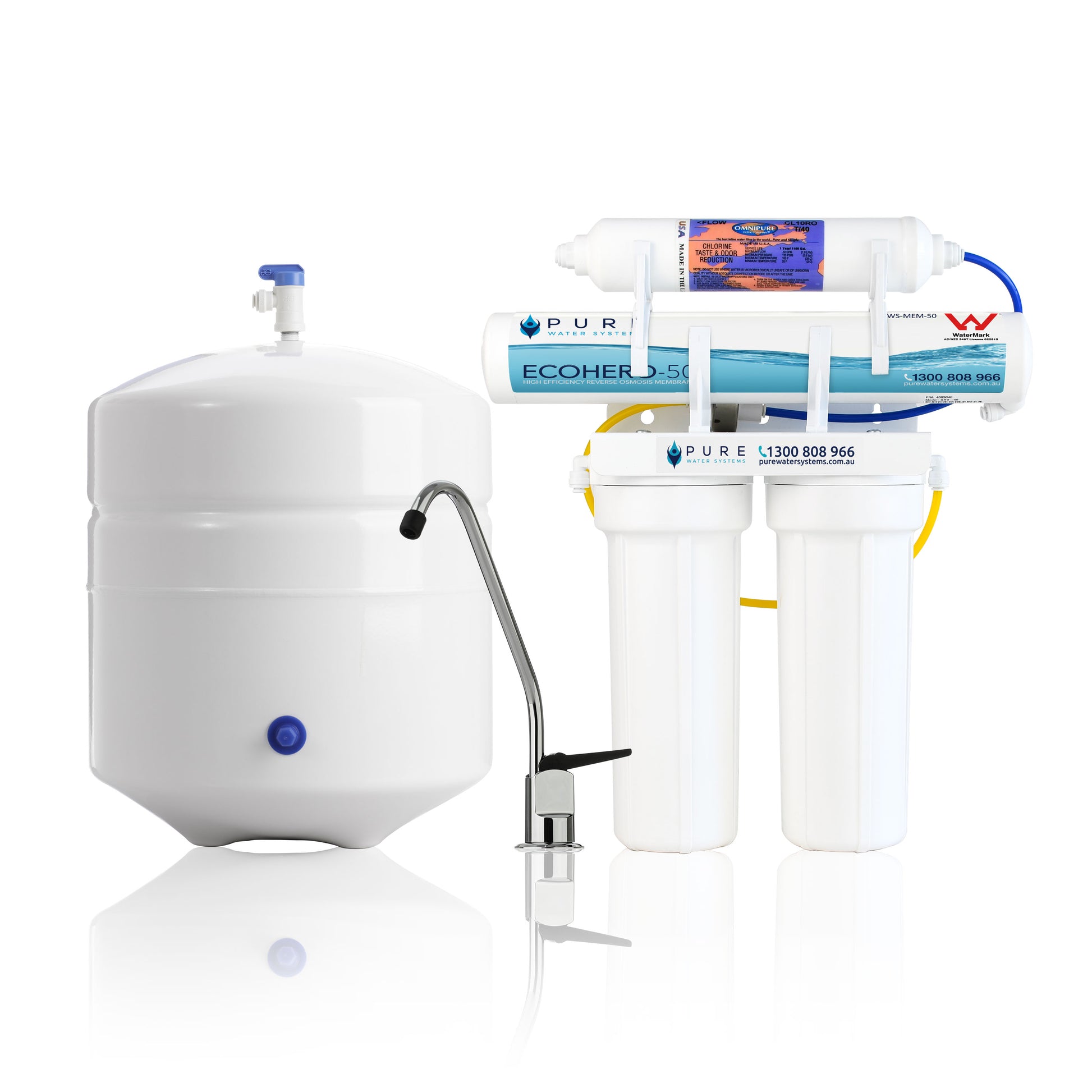 The under sink Eco Hero 4 Stage Reverse Osmosis system is Watermark certified and has NSF 42 certified components. This system comes ready to install, complete with cartridges and high-quality housing parts and fittings.