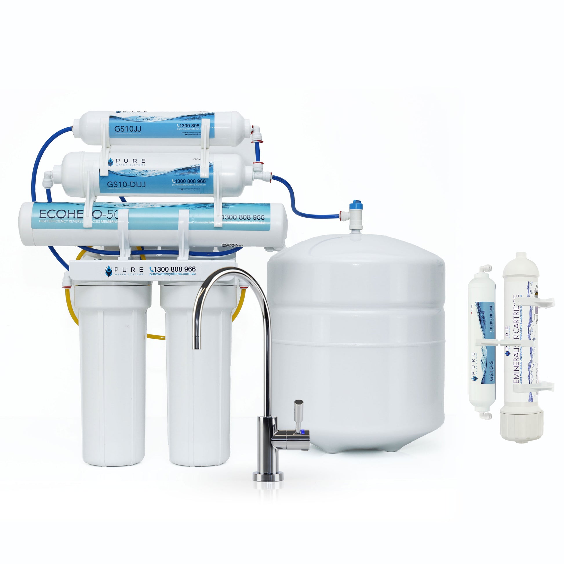 The under sink EcoHero 5 Stage Reverse Osmosis with Remineraliser system is WaterMark Certified and has NSF 42 Certified components. This system comes ready to install, complete with cartridges, a slimline faucet and high-quality housing parts and fittings.