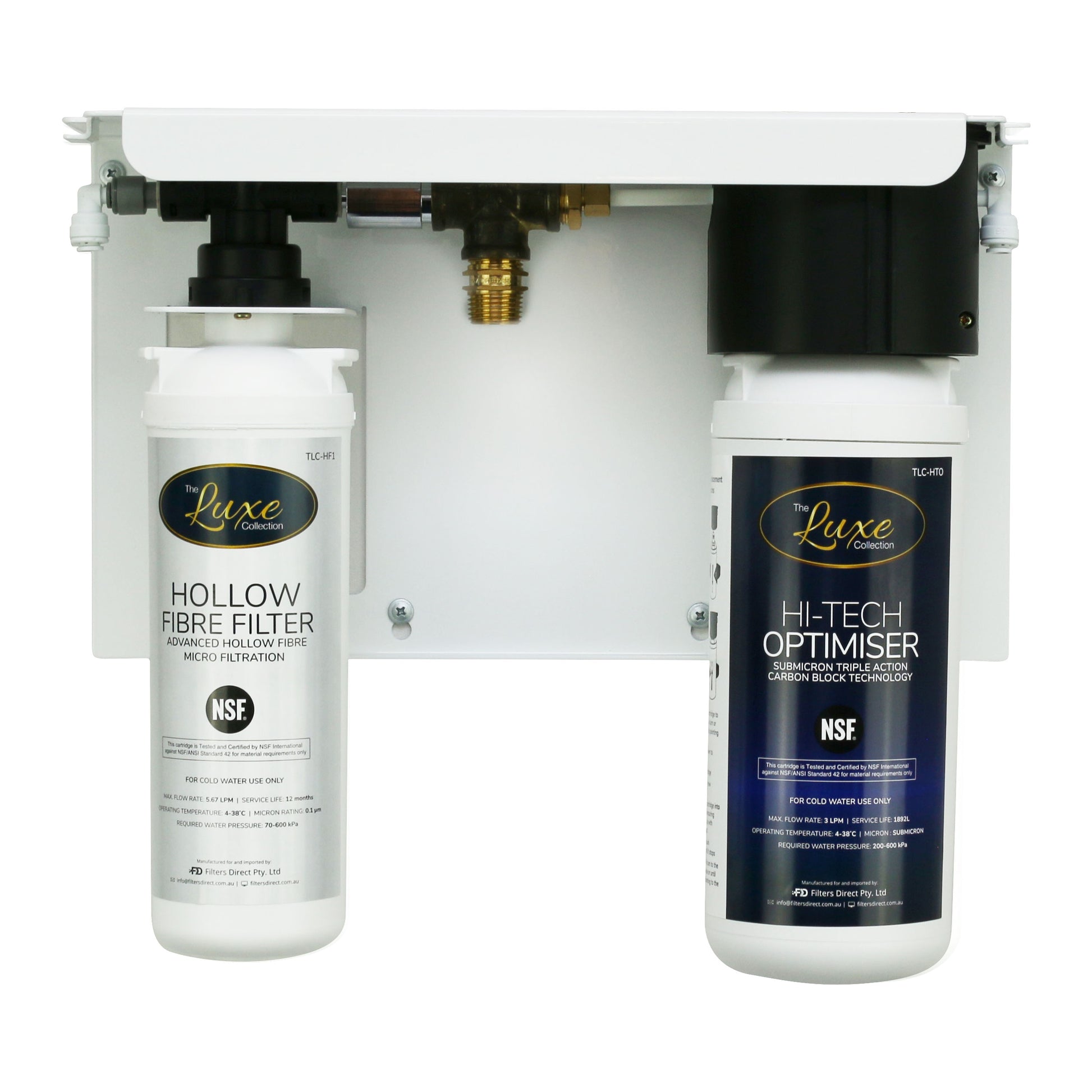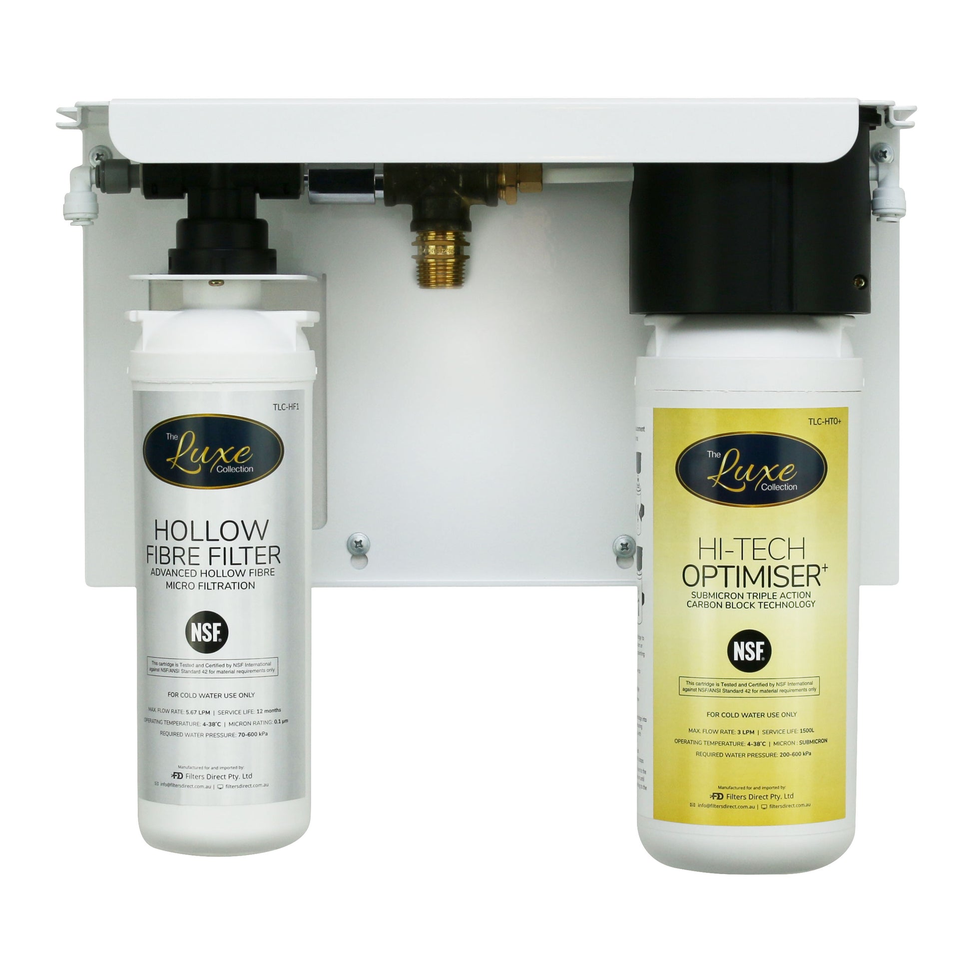 The Luxe Collection Dual Action High Flow Water Filtration System includes a Hollow Fibre Cartridge as the first stage of filtration and your choice of the compressed carbon Block, Hi-Tech Optimiser Cartridge (HTO) or the Hi-Tech Optimiser+ Cartridge (HTO+), as the second stage of filtration. ย
