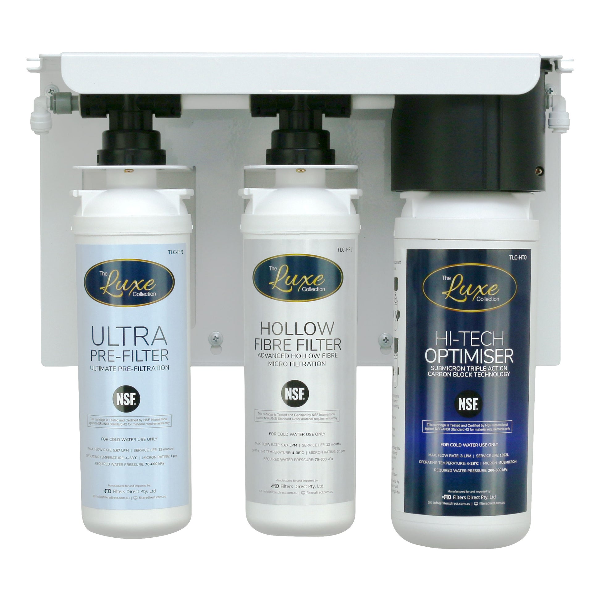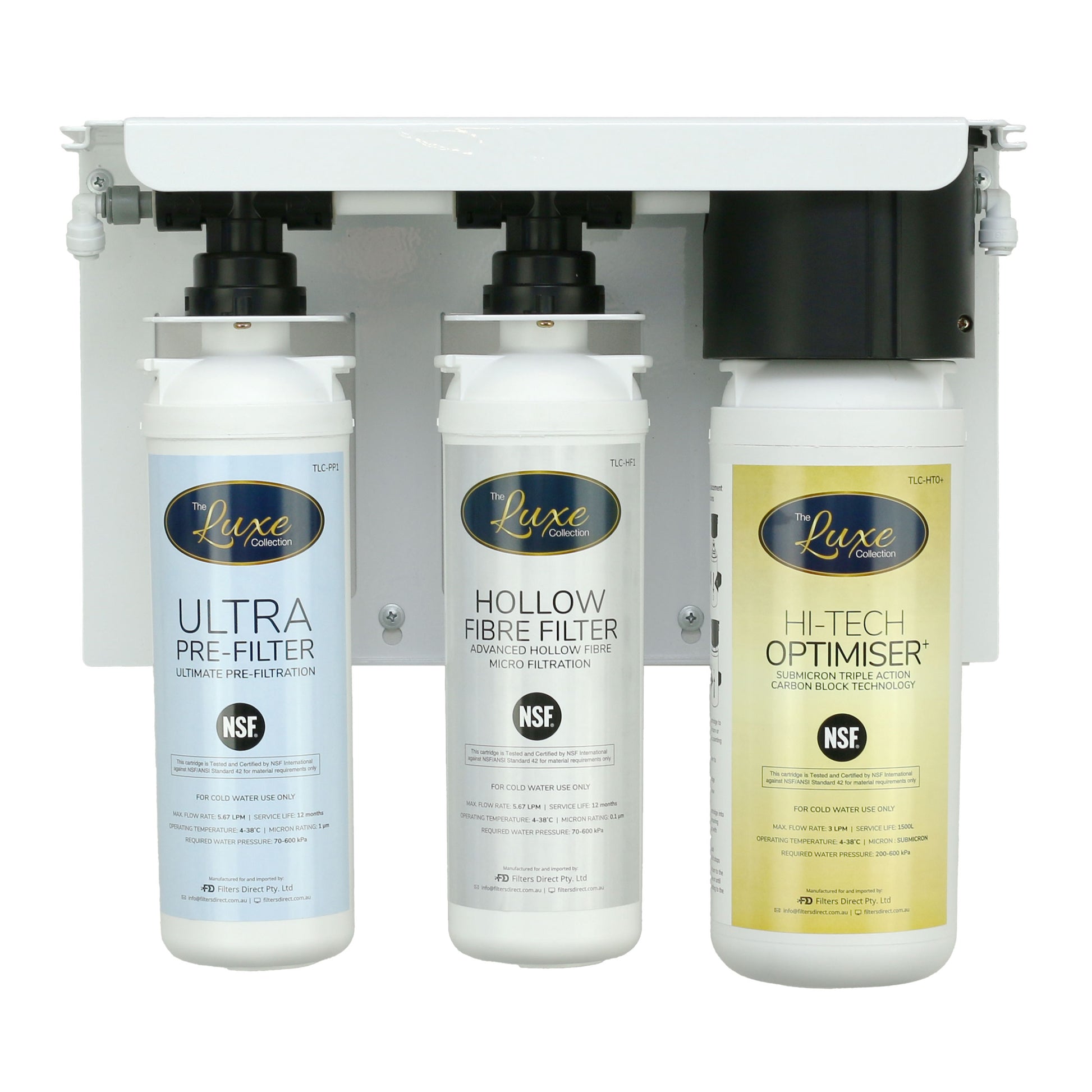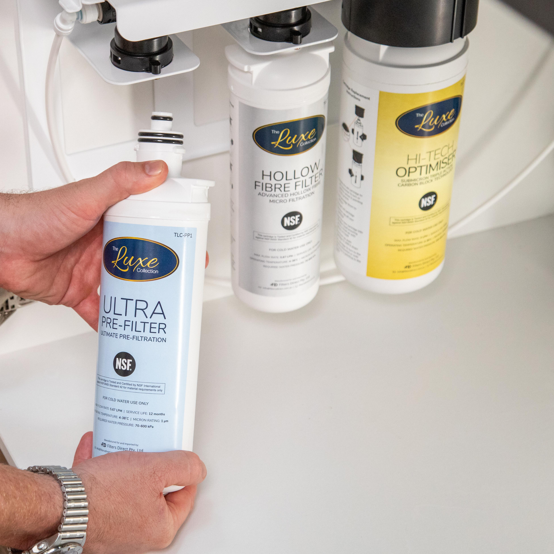 The Luxe Collection Triple Water Filtration System includes an Ultra Pre-Filter Cartridge as the first stage of filtration, a Hollow Fibre Cartridge as the second stage of filtration and your choice of the compressed carbon Hi-Tech Optimiser Cartridge (HTO) or the Hi-Tech Optimiser+ Cartridge (HTO+), as your final stage of filtration.