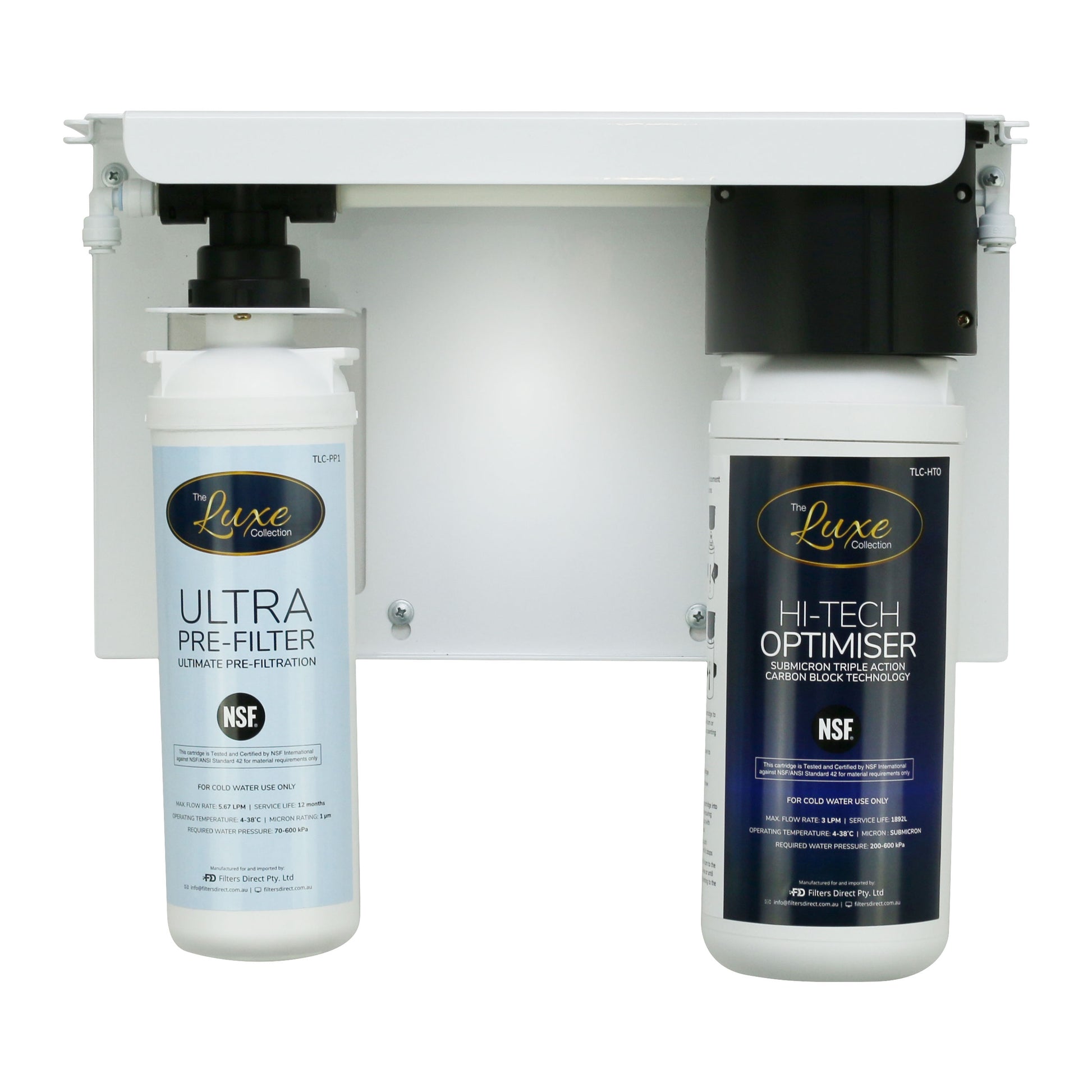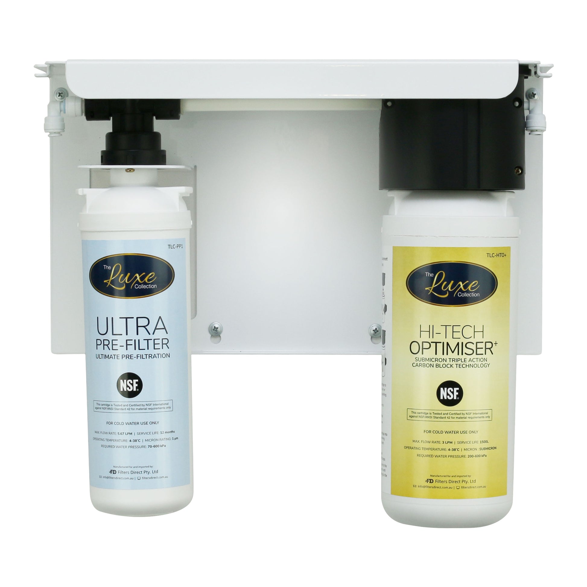The Luxe Collection Twin Water Filtration System includes an Ultra Pre-Filter Cartridge as the first stage of filtration and your choice of the compressed carbon block, Hi-Tech Optimiser Cartridge (HTO) or the Hi-Tech Optimiser+ Cartridge (HTO+), as the second stage of filtration.